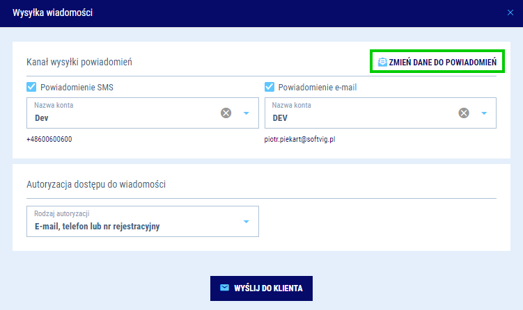 - funkcja umożliwia wysłanie wiadomości do Klienta