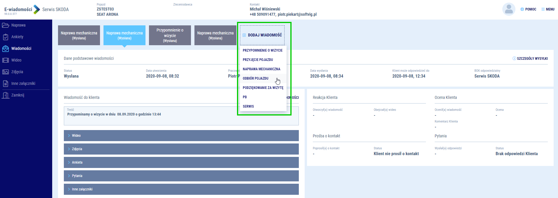Jeśli wiadomość zawiera ankietę z ofertą cenową lub pytania, to podczas tworzenia wiadomości system domyślnie załączy prośbę o podjęcie decyzji. Dodatkowo, jeżeli do naprawy został przypisany tylko jeden film, zostanie on załączony automatycznie do pierwszej wiadomości, jeżeli filmów jest więcej Doradca wybiera odpowiedni z listy.