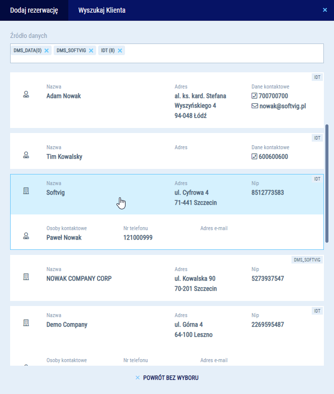 Edycja rezerwacji (wyszukiwanie kontrahenta)