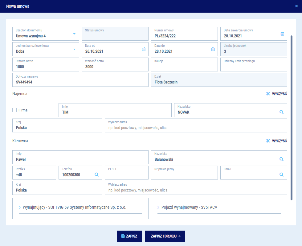Aby zapisać umowę, uzupełnij pełne dane w sekcjach Najemca oraz Kierowca. Po zapisaniu dane z umowy zostaną automatycznie przeniesione do okna Wydanie, co pozwoli Ci wydać pojazd do jazdy testowej.