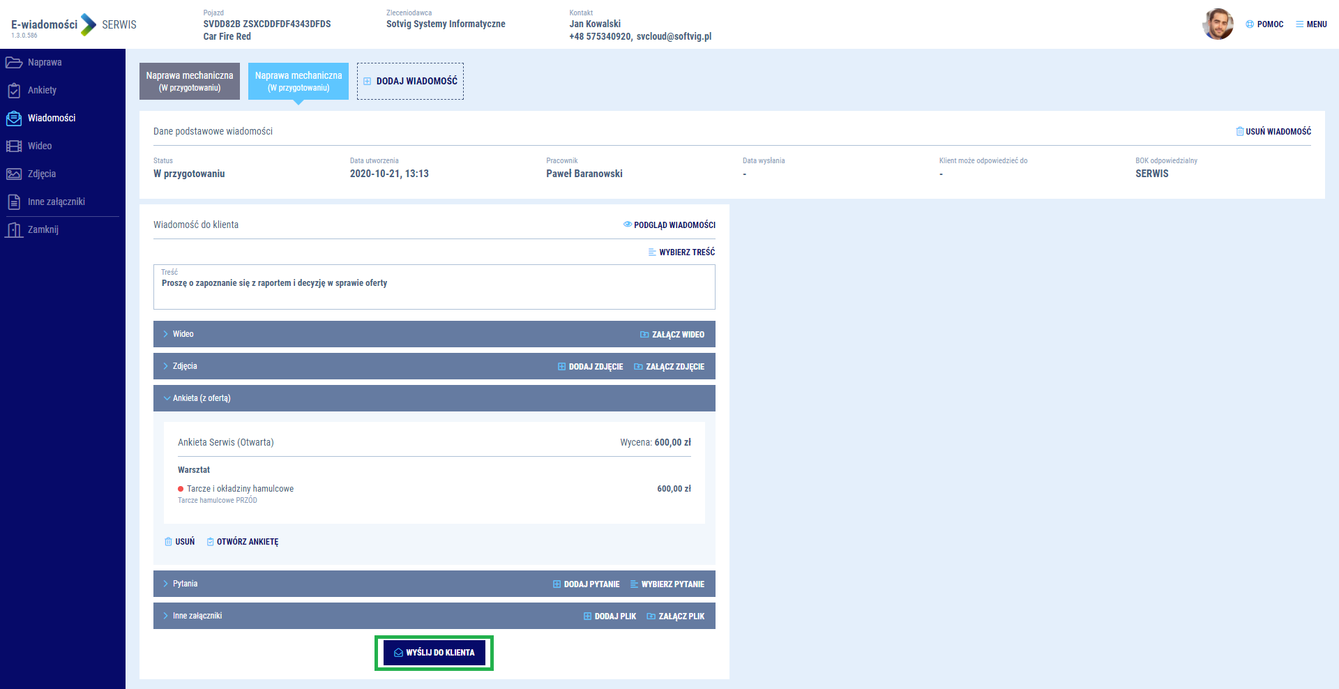 Możesz wysłać wiadomość do klienta jedynie przy pomocy aplikacji Video Service, używając komputera. Aby wysłać e-wiadomość z załączoną ankietą wyszukaj pojazd po numerze rejestracyjnym na liście napraw.