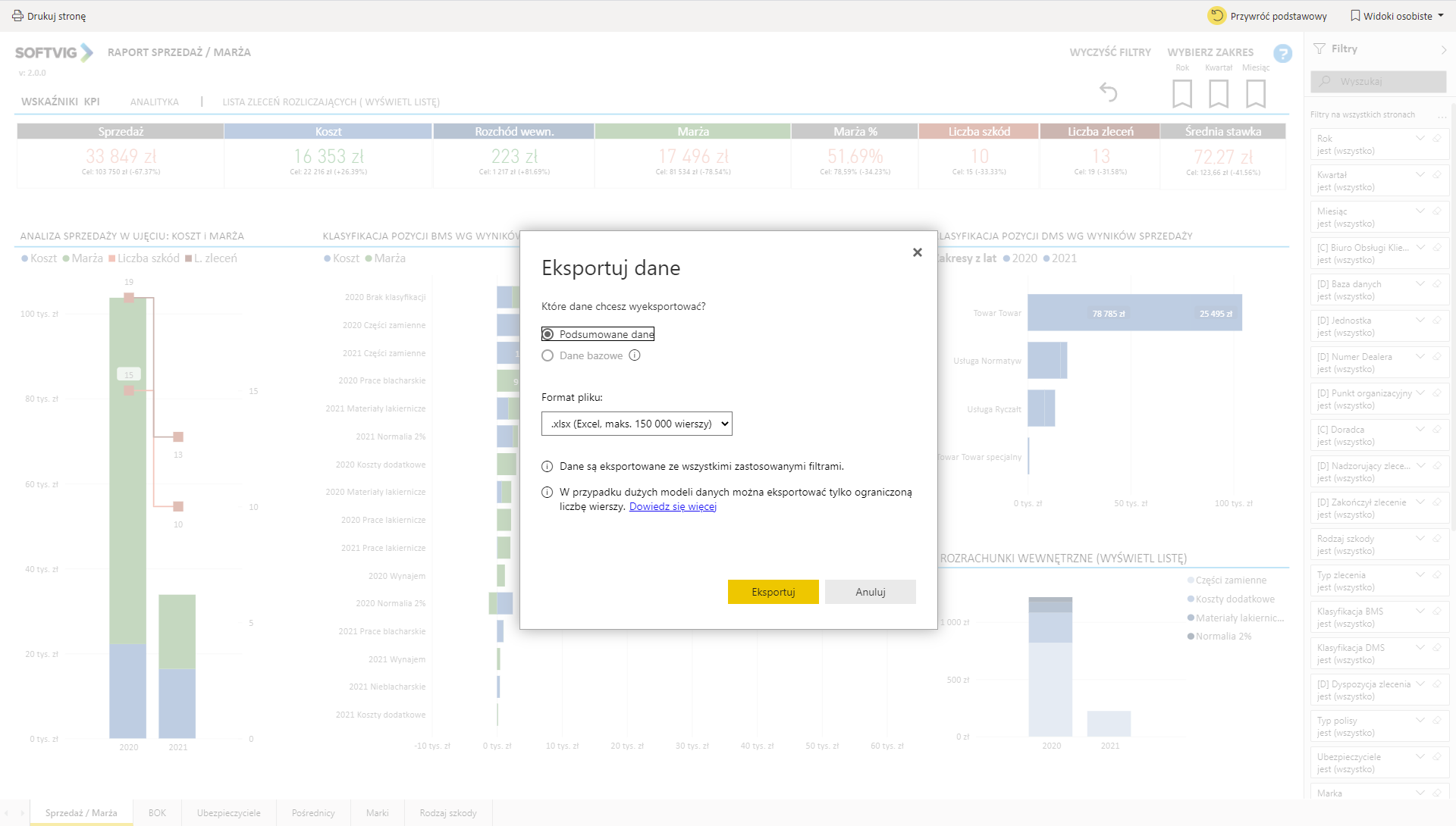 Większość danych przedstawionych w raporcie BI, możesz wyeksportować przy użyciu jednej z opcji dodatkowych