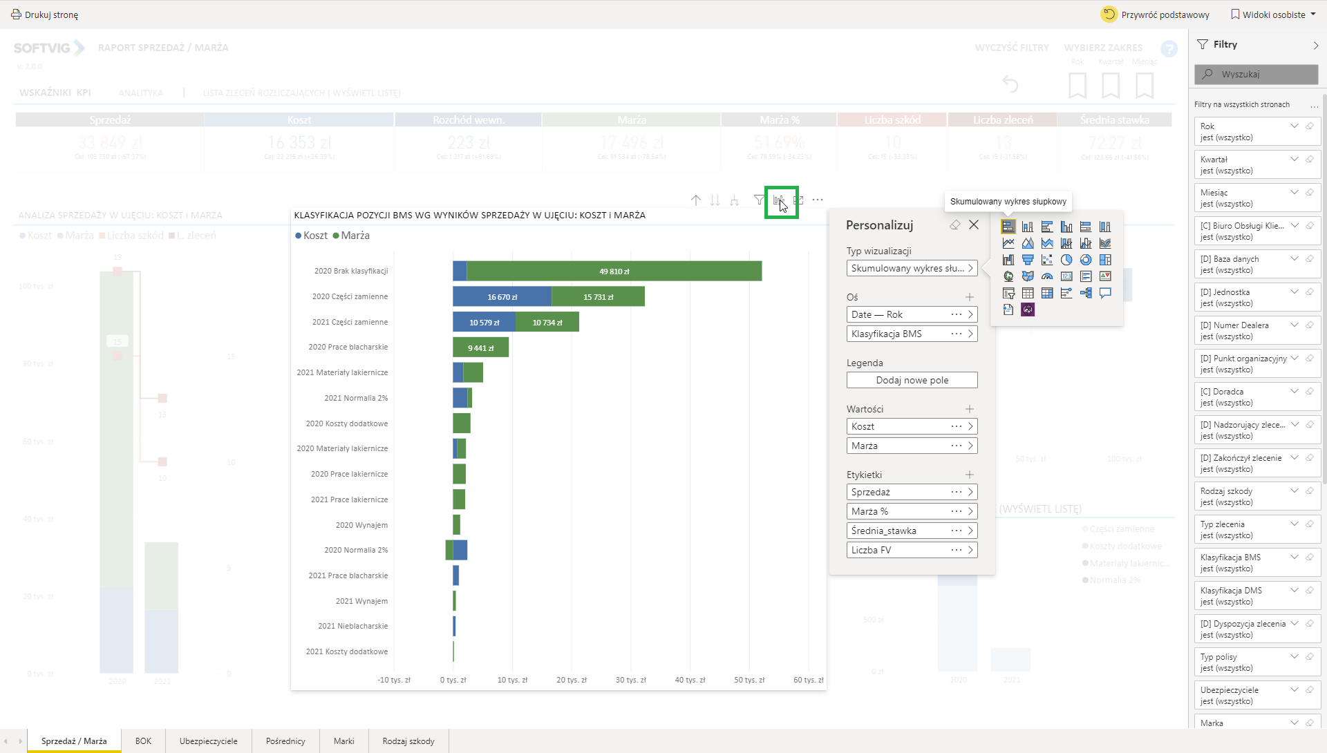 Każdy raport BI zawiera różne elementy wizualne (np. wykresy słupkowe), które przedstawiają dane w określony sposób. Możesz samodzielnie zmieniać wygląd swoich wizualizacji w raportach, aby je w pełni spersonalizować. Aby to zrobić kliknij w ikonę