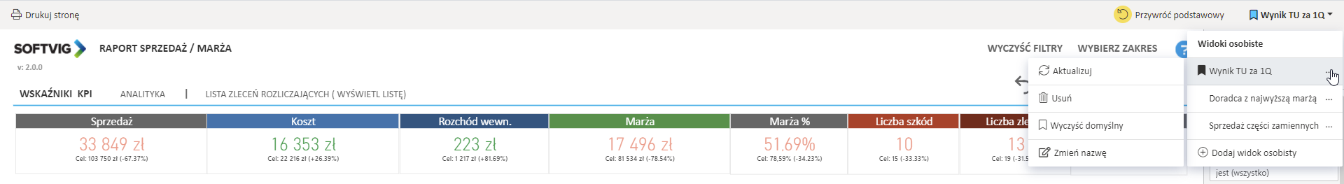 Twój widok osobisty, który został przez Ciebie dodany jako domyślny, zawsze uruchomi się na start raportu BI. W prawym górnym rogu okna raportu pojawi się odpowiednie oznaczenie