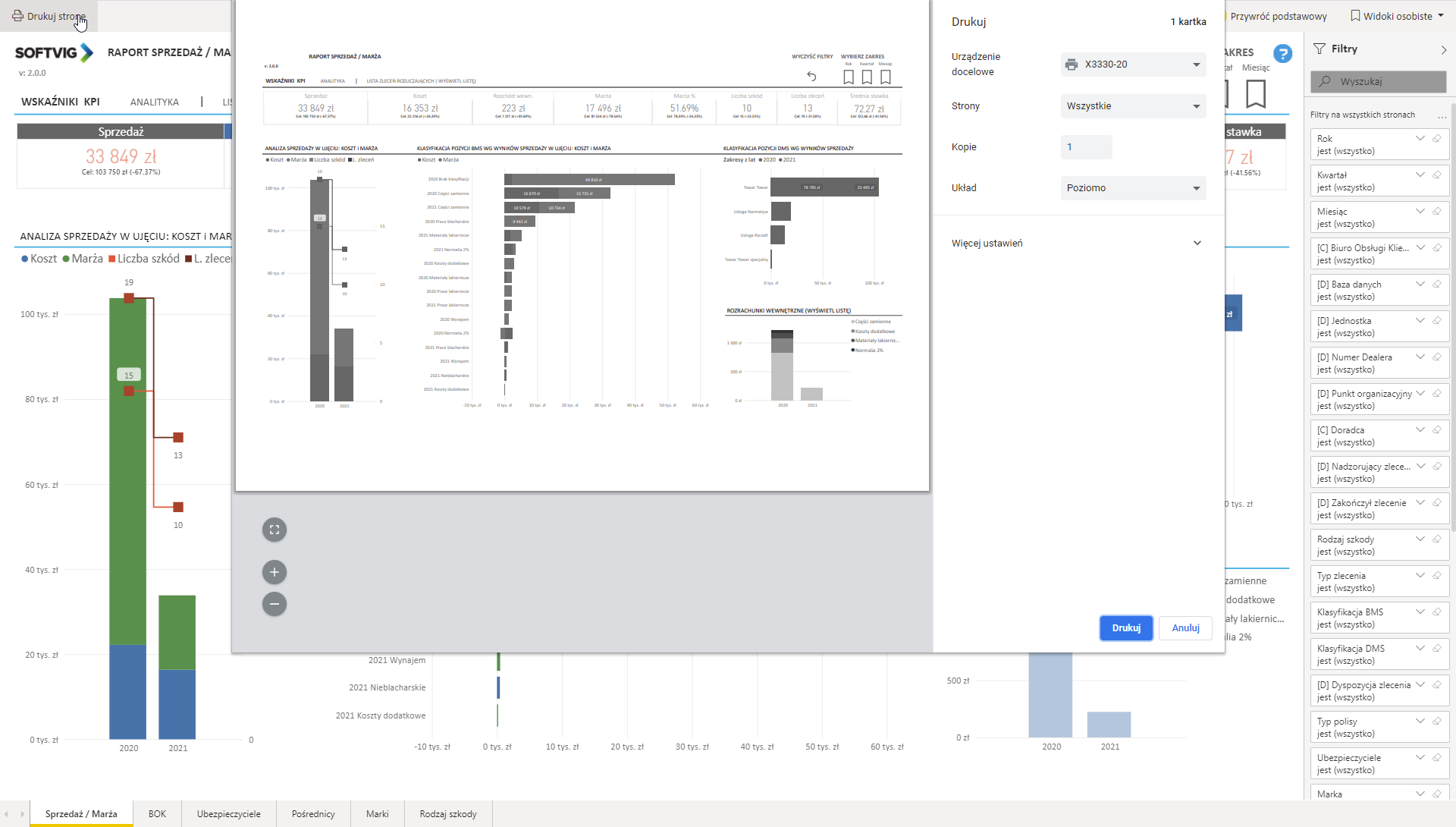 , znajdującą się w lewym górnym rogu strony. Kliknięcie w drukarkę spowoduje uruchomienie kreatora wydruku aktualnej strony raportu BI.