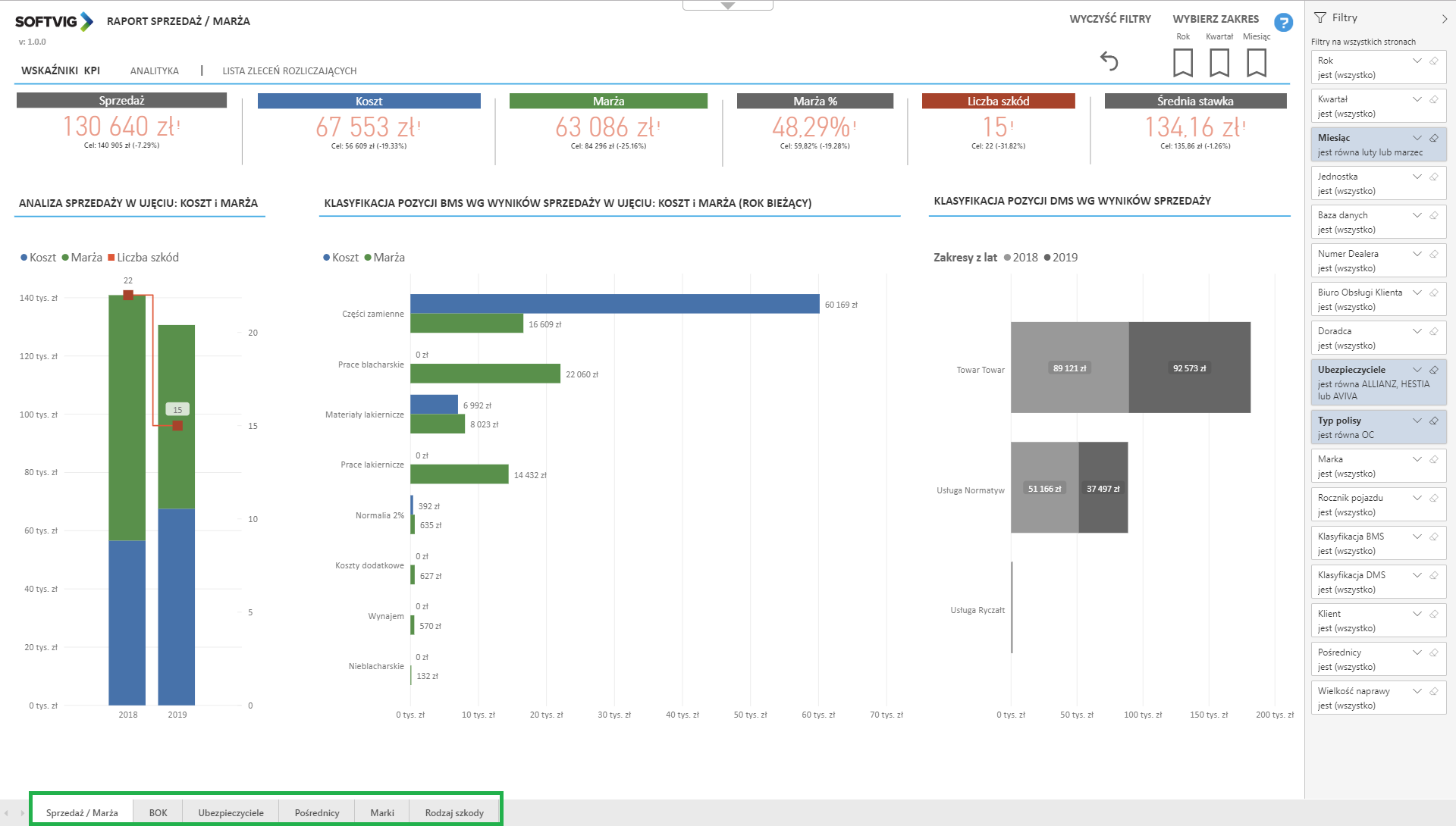 Zwróć uwagę na to, że niektóre raporty BI są bardziej rozbudowane i posiadają zakładki znajdujące się w dolnej sekcji raportu BI. Kliknij w taką zakładkę aby przejść do nowej strony, która zawiera dodatkowe informacje raportowe.