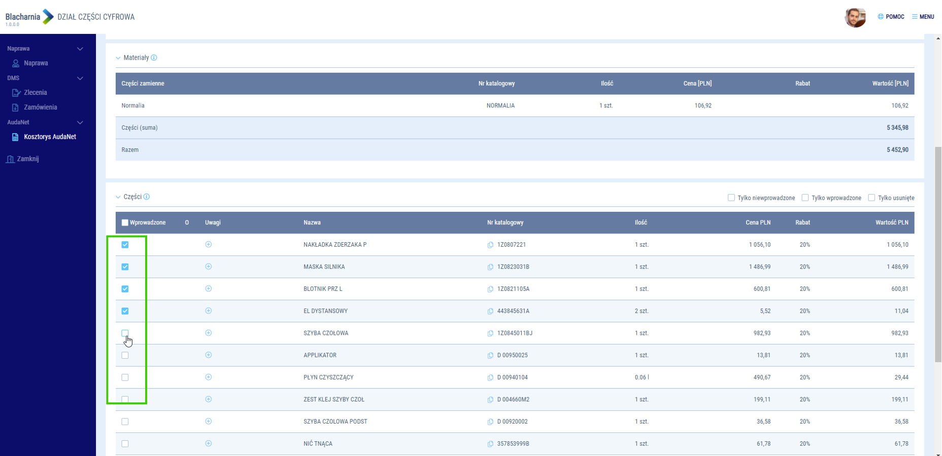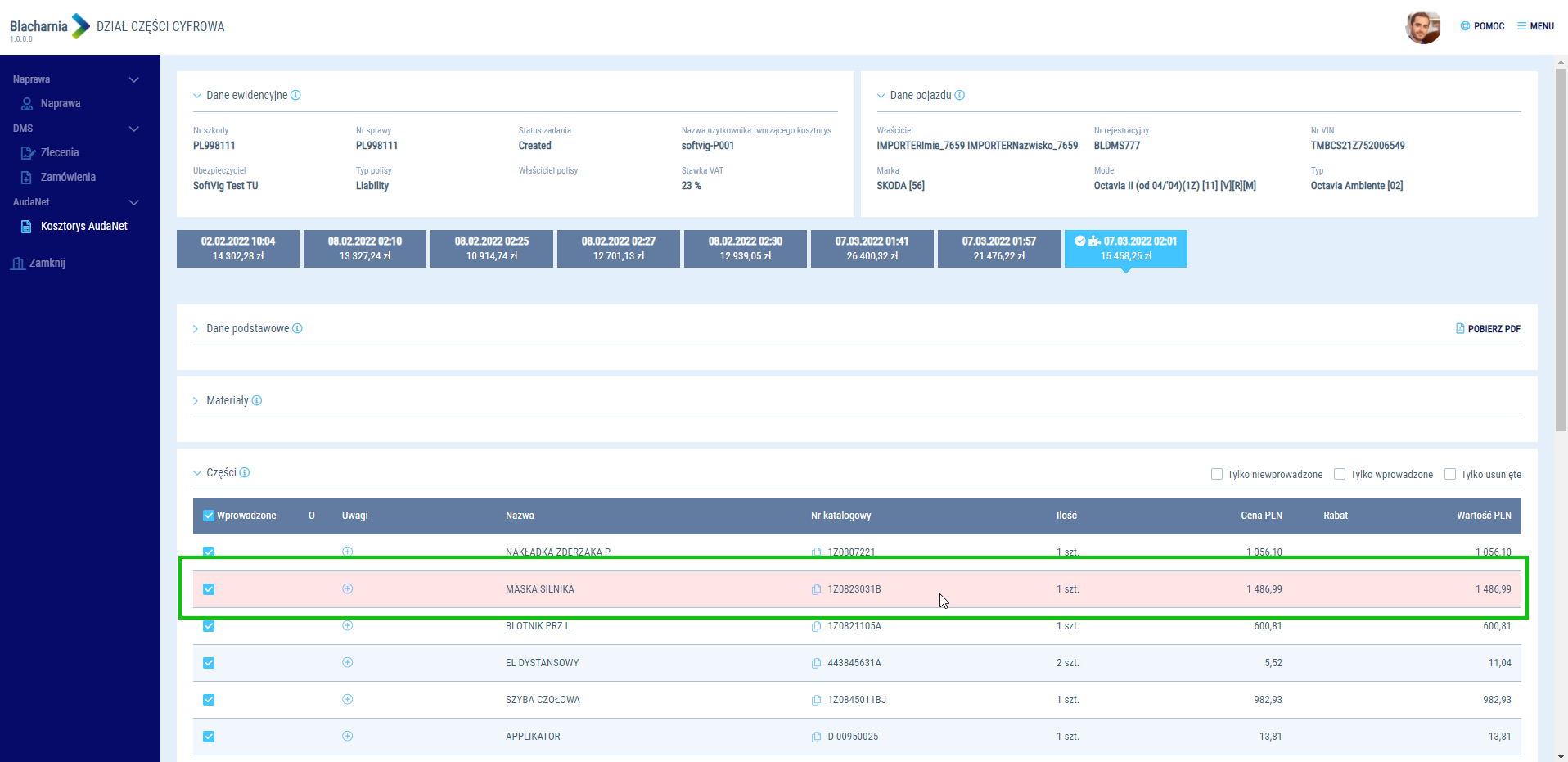 Jako pracownik działu części możesz w łatwy sposób organizować pozycje zamówionych części. Kliknij dwukrotnie na teczkę naprawy i wybierz operację (screen przejdź do pełnej teczki naprawy). Następnie przejdź do sekcji (screen sekcji kosztorys audanet)
