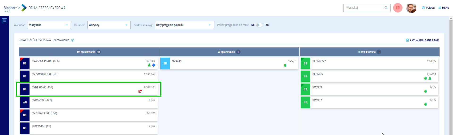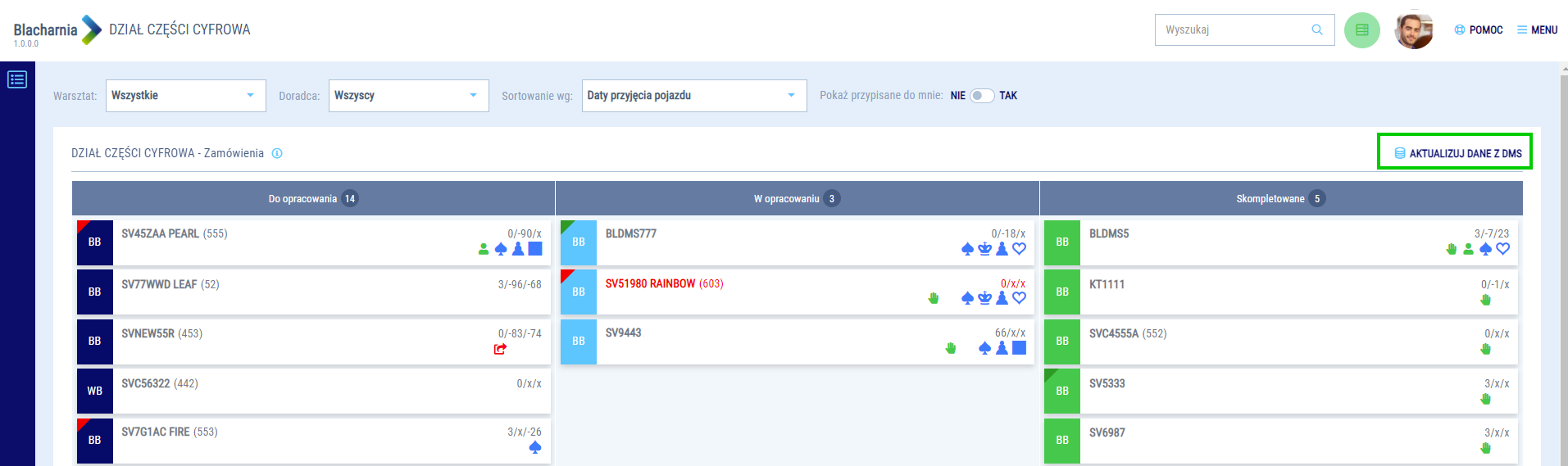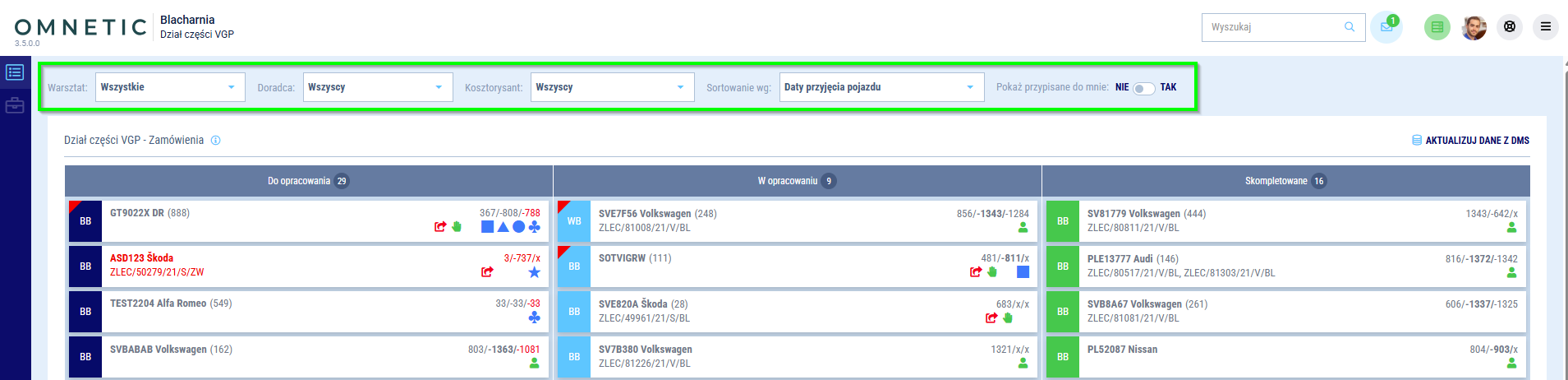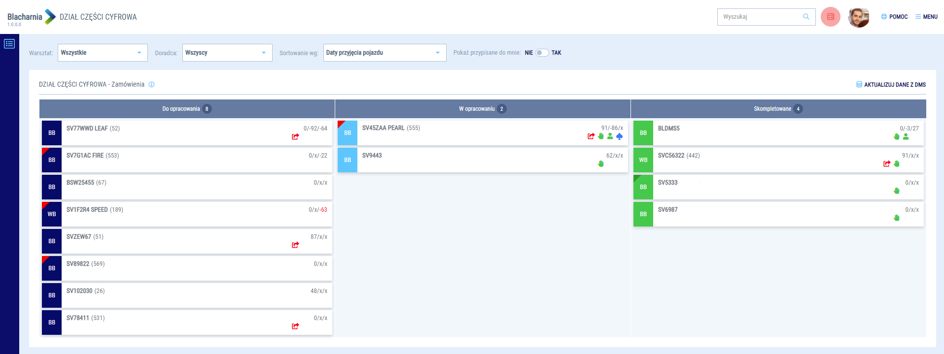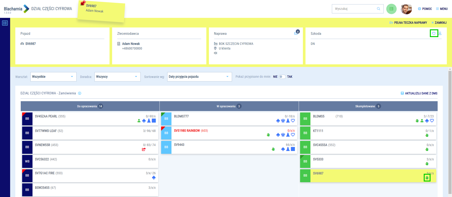 Aktualizacja statusu dokumentów odbywa się co 15 minut. W zależności od stanu dokumentów i położenia teczki na tablicy działu części, możesz kontrolować status części w kilku miejscach w usłudze Blacharnia.