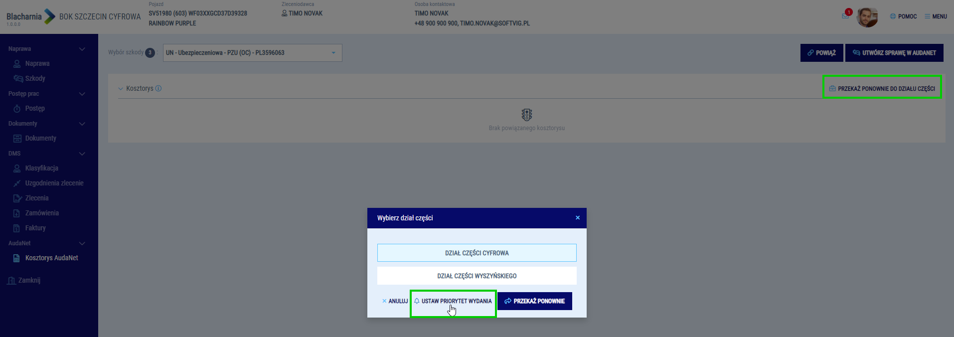 Wybór operacji ponownej wysyłki do działu części umożliwi Ci oznaczenie priorytetu wydania. W dziale części takie zlecenia są oznaczone czerwoną czcionką. Pamiętaj, że operacja jest dostępna wyłącznie dla szkód, które zostały już wysłane do działu części.