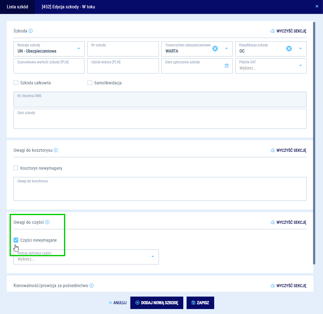 Nie chcesz, aby na konkretnej szkodzie wyświetlał się status części? Możesz to zmienić w edycji szkody. Ustaw brak wymagalności części. Dzięki temu status dotyczący części zostanie ustawiony jako zakończony i oznaczony na zielono.