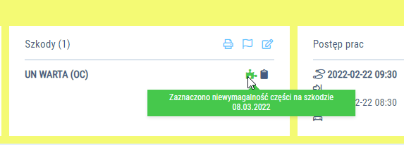 - Brak ikony puzzla - dla teczki naprawy wszystkie szkody mają zrealizowane zamówienia na części (wydane lub skompletowane), a od operacji upłynęło X dni.