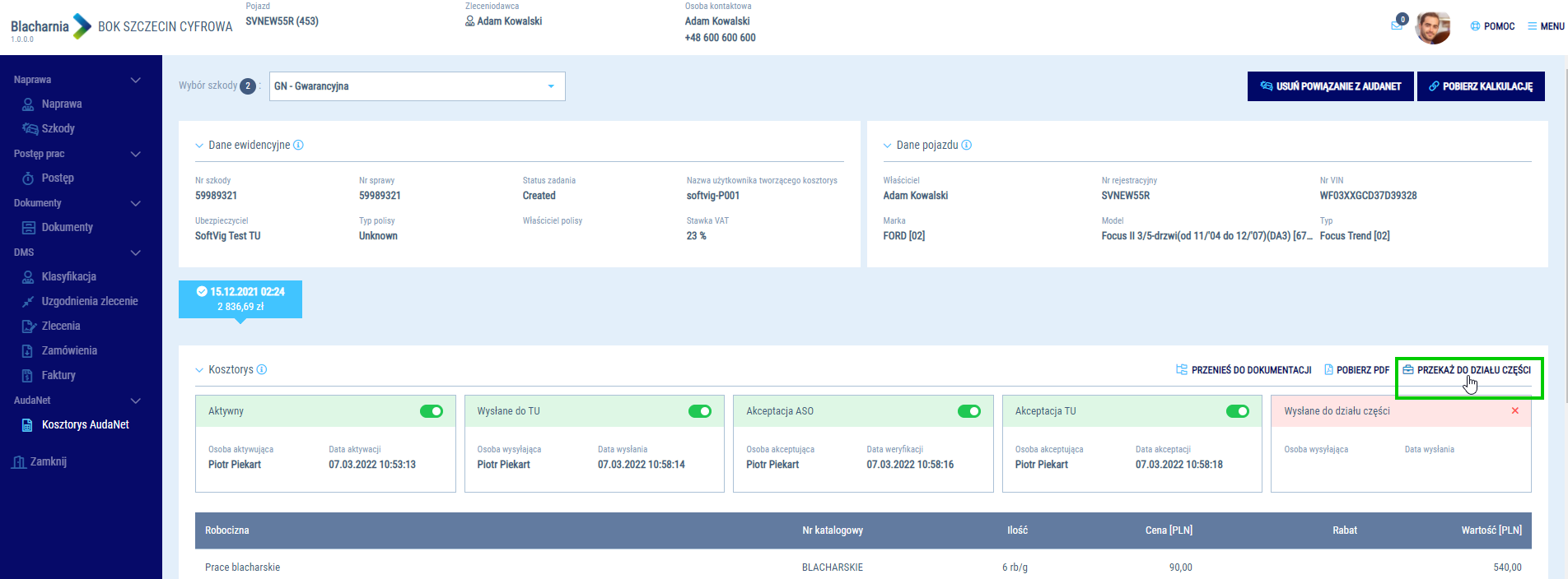 Przekazanie szkody do działu części