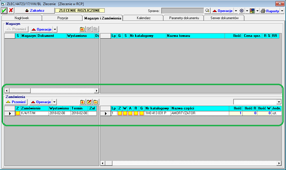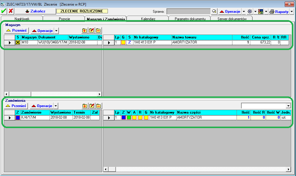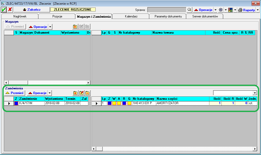 - Utworzone zamówienie na części