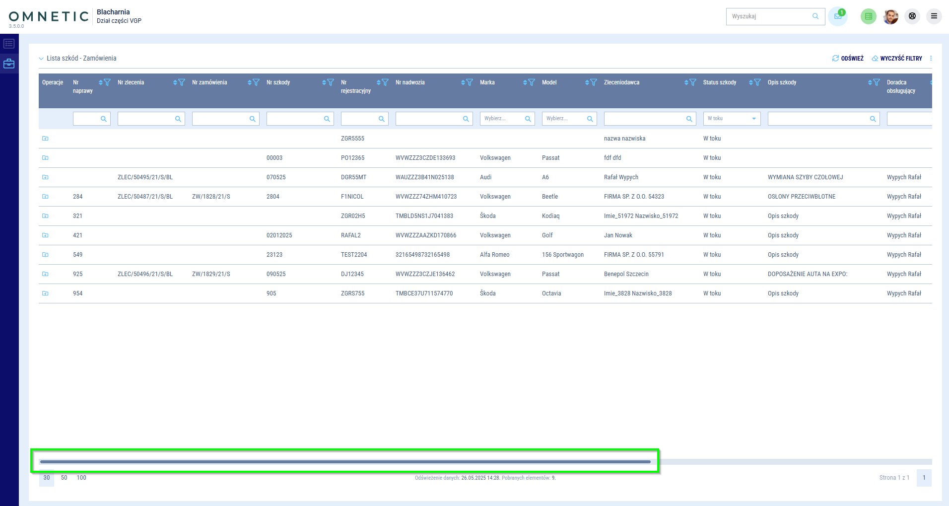 Lista szkód - zamówienia - prezentuje wszystkie szkody przekazane do Działu części, niezależnie od stanu kompletacji. Lista pozwoli Ci przeszukiwać wszystkie szkody które zostały przekazane do Działu części.