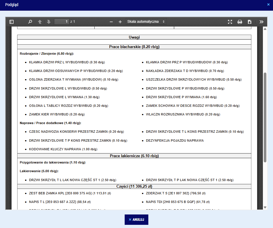 znajdującą się na kontekście naprawy. Otrzymasz listę prac blacharskich i lakierniczych z rbh, oraz części z cenami. Wszystkie dane będą pochodzić z aktywnego kosztorysu AudaNet.
