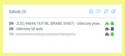 - Przekreślona pozycja na kontekście naprawy w sekcji szkody oznacza, że szkoda została anulowana.