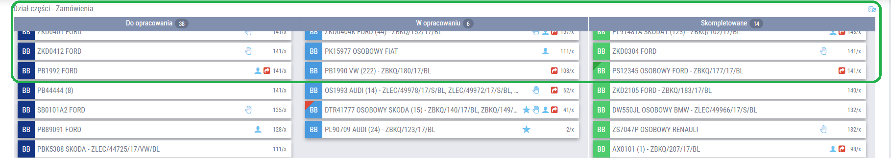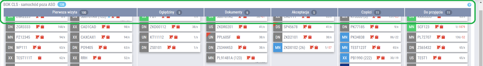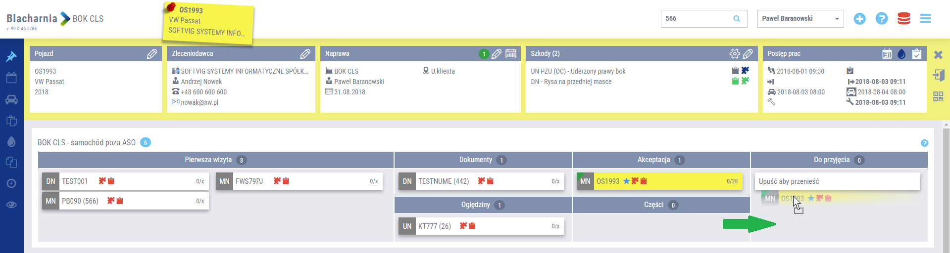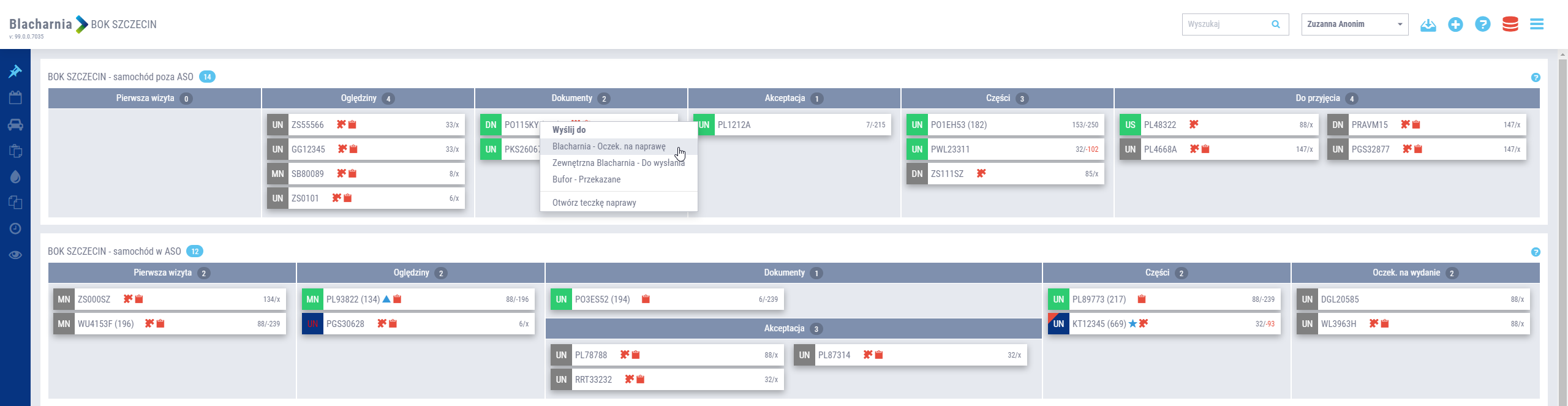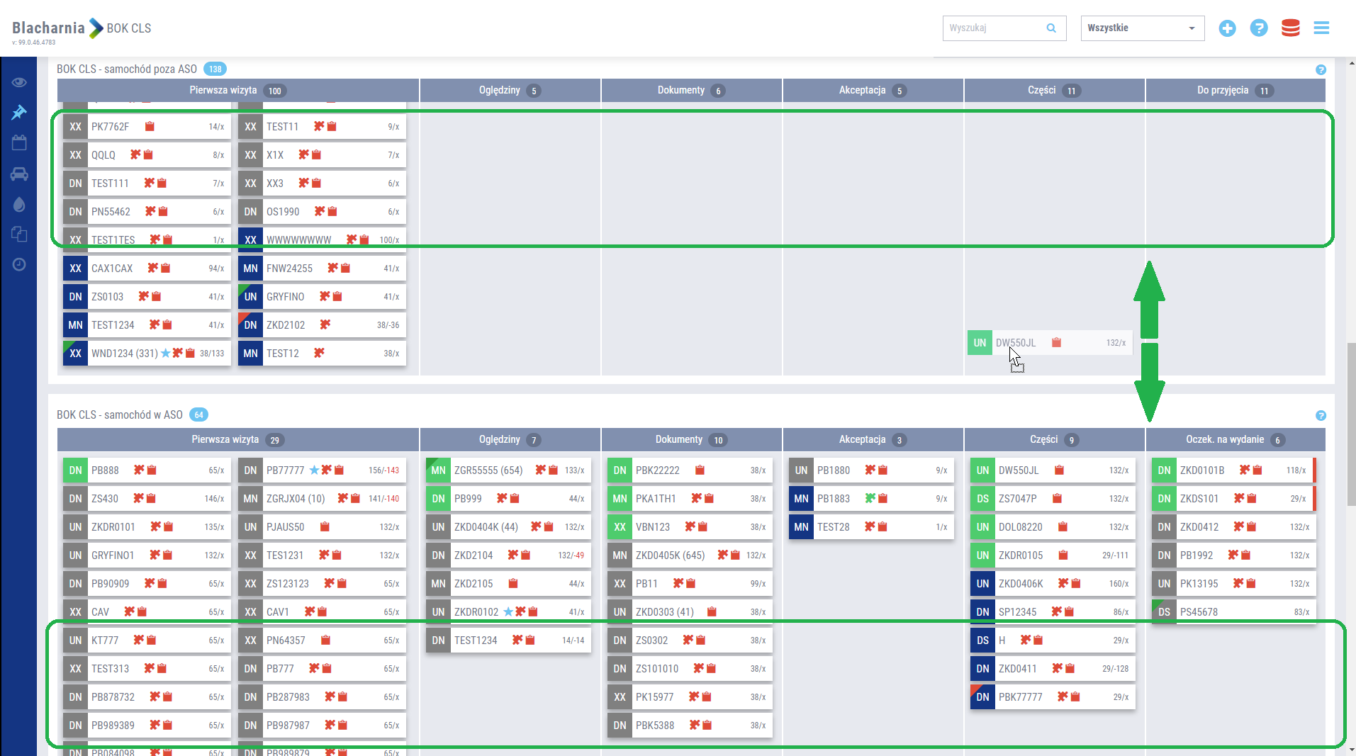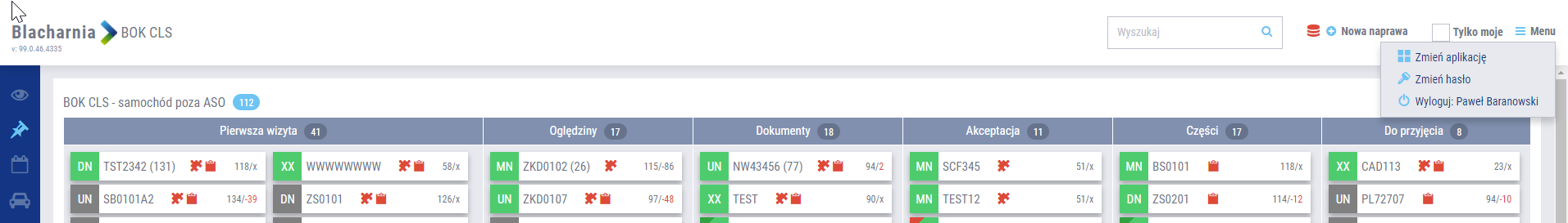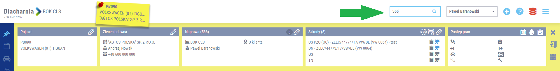 Zarówno na tablicy zarządzania szkodami BOK, w warsztacie blacharsko-lakierniczym, jak i w dziale części, wprowadzono blokowanie nagłówka danej sekcji, do której przynależą teczki napraw. Pasek nagłówka jest blokowany przy przewijaniu strony, co ułatwia nawigację w przypadku dużej ilości danych, bez utraty informacji o nagłówku sekcji. Po zmianie sekcji następuje płynne przejście pomiędzy nagłówkami i zablokowanie tego aktywnego, w sekcji, w której aktualnie użytkownik się znajduje.