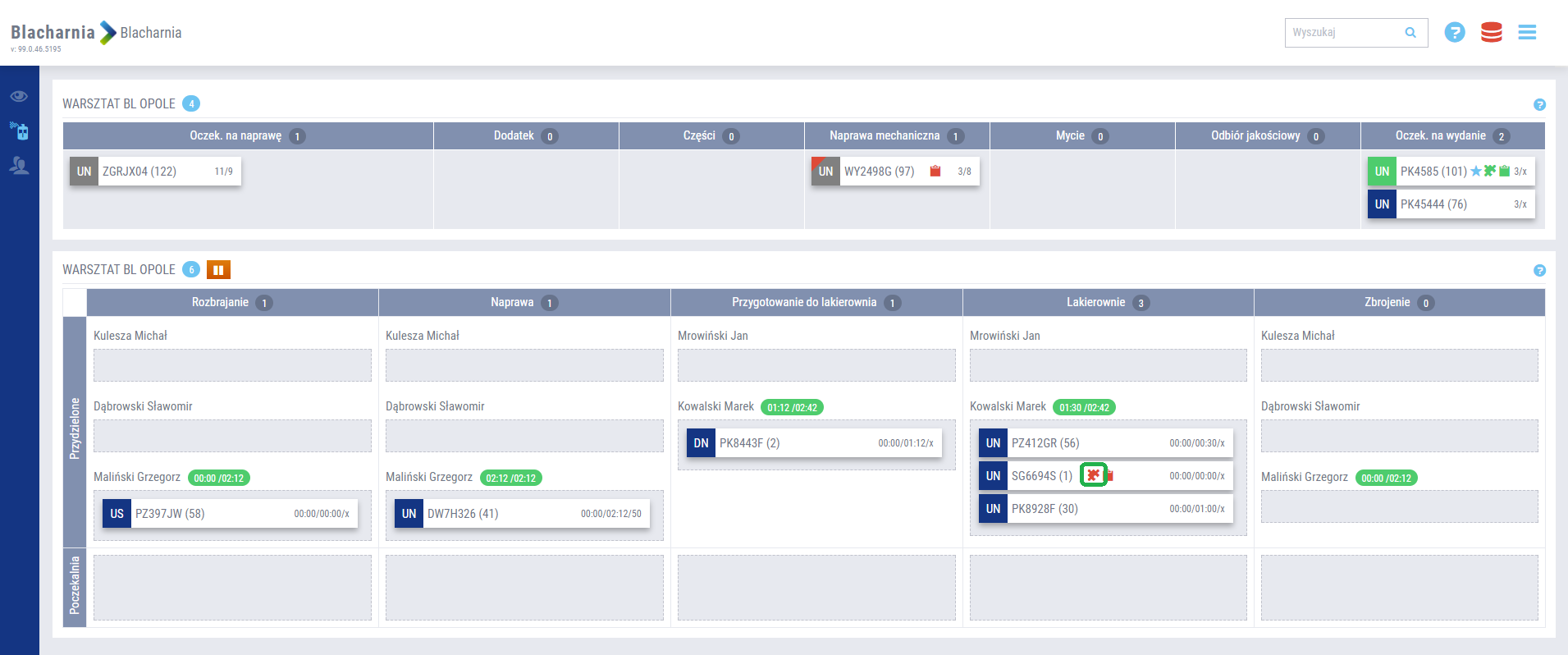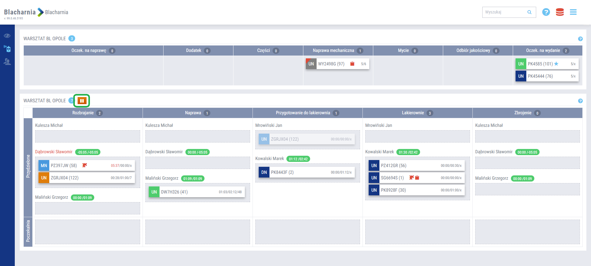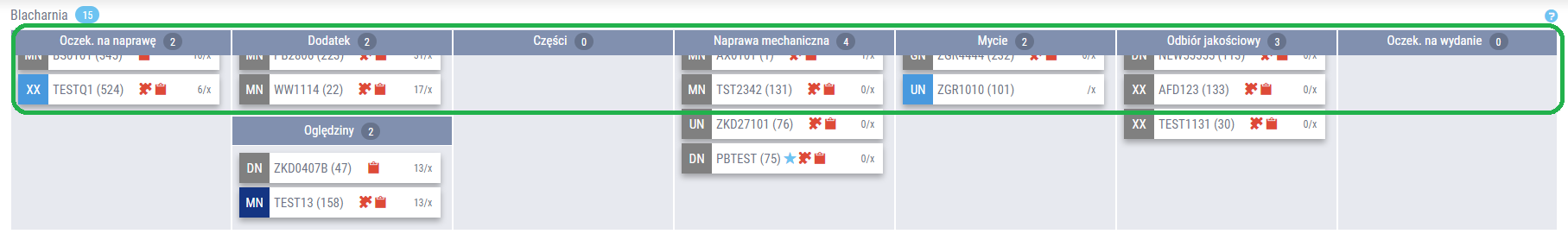 Kolorystyka przedstawiona w oknie powiadomień blacharni prezentuje aktualny status w zależności od wskazanego etapu naprawy.