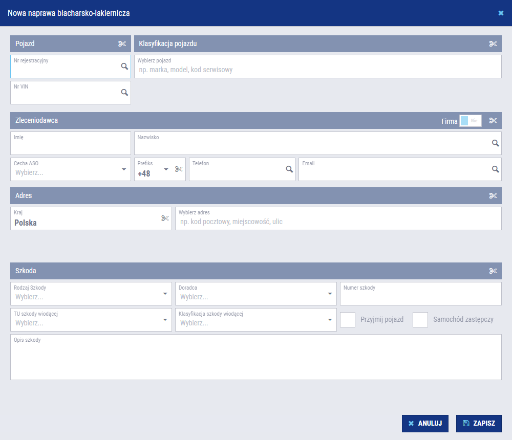 - Wybranego BOK obsługującego naprawę