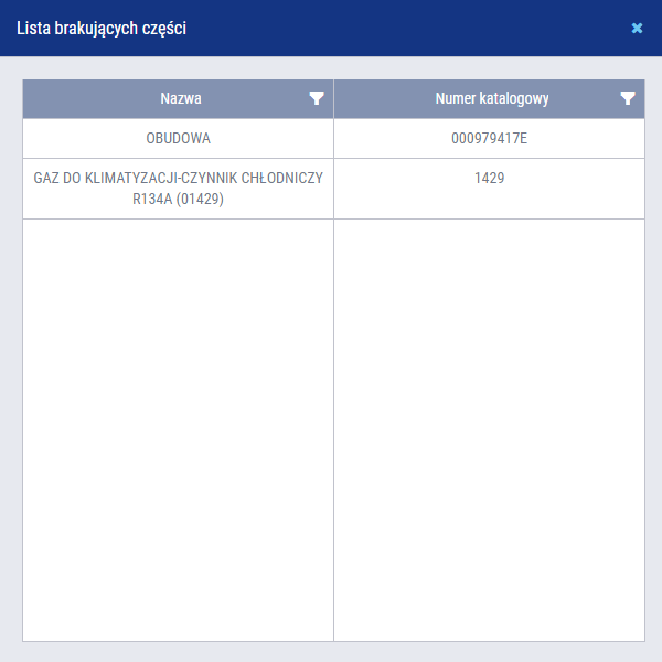 Funkcjonalność ta umożliwia szybkie wyświetlanie informacji o brakujących częściach, bez konieczności przechodzenia do zamówienia w teczce naprawy. W celu uruchomienia okna wystarczy kliknąć lewym przyciskiem myszy na ikonę