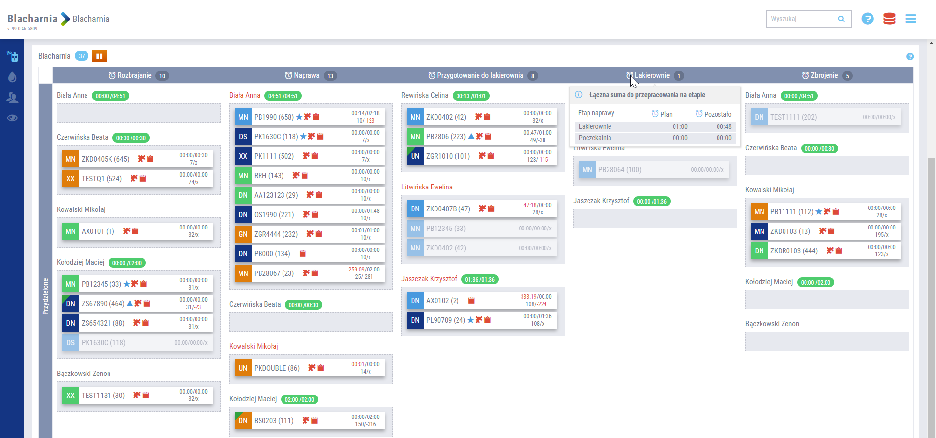- Podsumowanie czasu na kolejnych etapach pracy blacharsko-lakierniczej – prezentacja sumy czasu potrzebnej do zrealizowania zadania na wskazanym etapie. Widok, to porównanie czasu wszystkich napraw, które znajdują się na kolejnych etapach pracy. Informacja przedstawiona jest w dwóch aspektach: