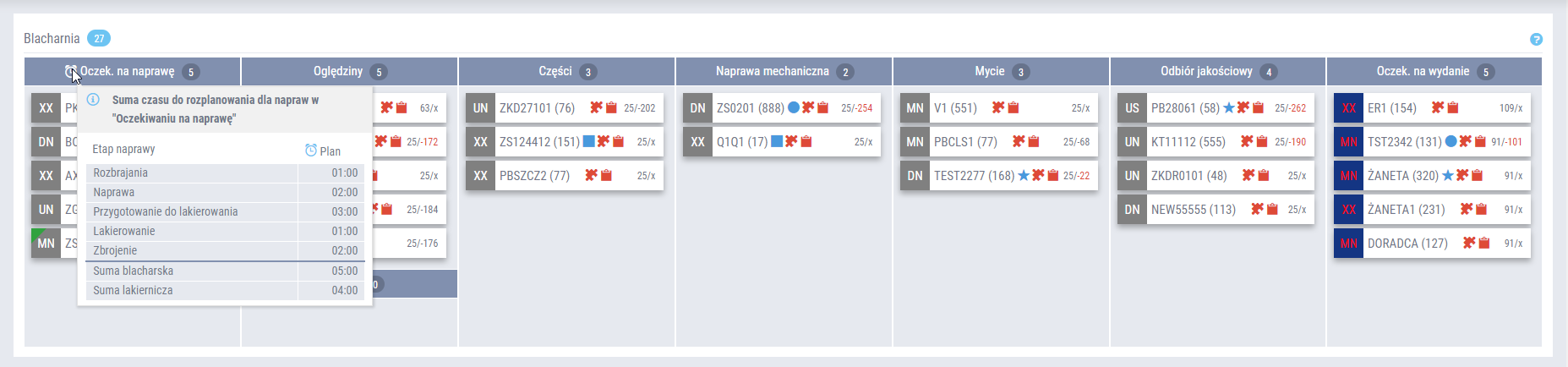 - Podsumowanie czasu na etapie „Oczekiwanie na naprawę” – informacja o czasie do przepracowania – sumarycznie - w podziale na etapy pracy. Powiadomienie jest widoczne zarówno z poziomu tablicy warsztatu blacharsko-lakierniczego , jak i tablicy zarządzania szkodami BOK. Jest to prezentacja „planu”, czyli czasu wszystkich napraw znajdujących się na etapie „Oczekiwanie na naprawę”. Jest on zgodny z wyceną pochodzącą z kosztorysu AudaNet, lub ustawioną ręcznie czasochłonnością.