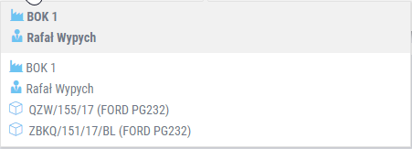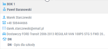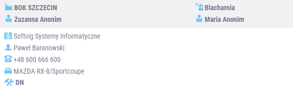 Ustawienie kursora na teczce naprawy uruchamia okno informacyjne, w którym dostępne są podstawowe dane dotyczące naprawy. W zależności od miejsca w aplikacji, okna mogą się różnić. Ich wygląd zależy od zapotrzebowania na dane, z których korzysta określony dział (tj. obsługa klienta, pracownicy warsztatu itp.).