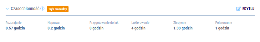 Czasochłonność prezentuje zdefiniowany czas naprawy blacharsko-lakierniczej. Czas przedstawiony jest w podziale na najważniejsze etapy procesu naprawy, występujące na tablicy warsztatu blacharsko-lakierniczego, takie jak: