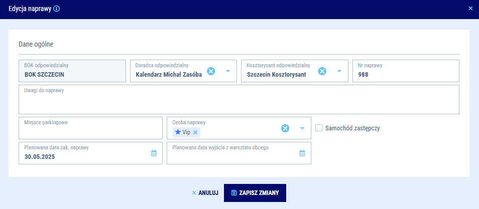 Aby edytować naprawę wybierz operację w sekcji naprawy. Oprócz edycji podstawowych informacji, które uzupełniasz przy tworzeniu naprawy, możesz również uzupełnić dodatkowe dane: