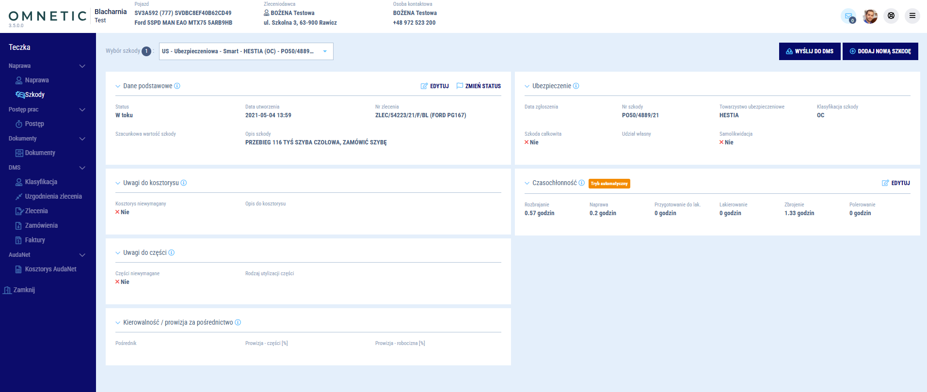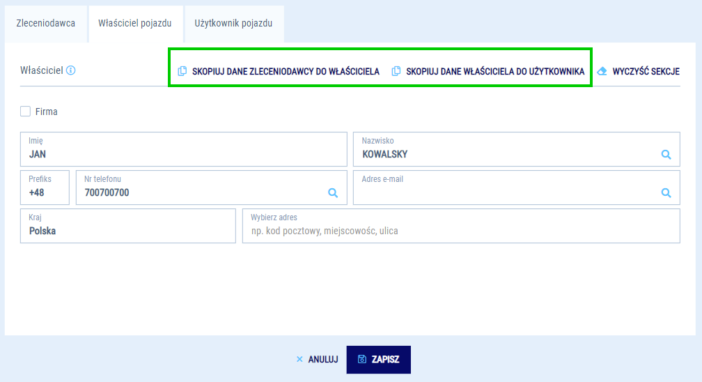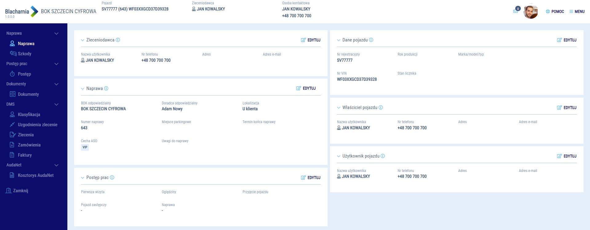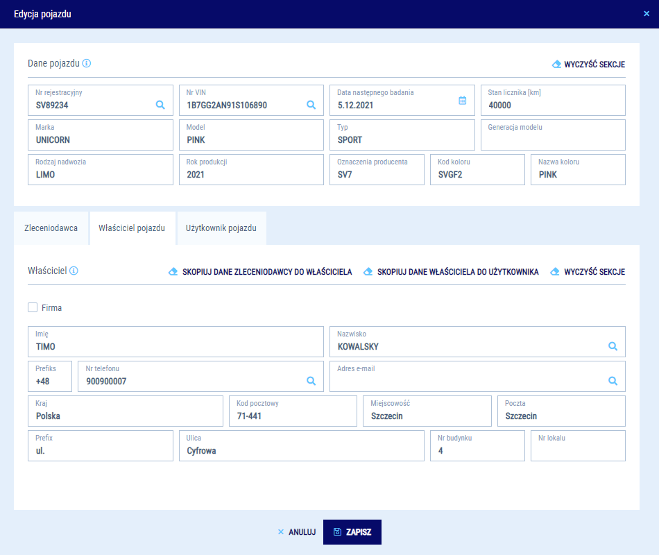 Możesz od razu edytować wszystkie dane dotyczące pojazdu, zleceniodawcy, jak i właściciela oraz użytkownika pojazdu.