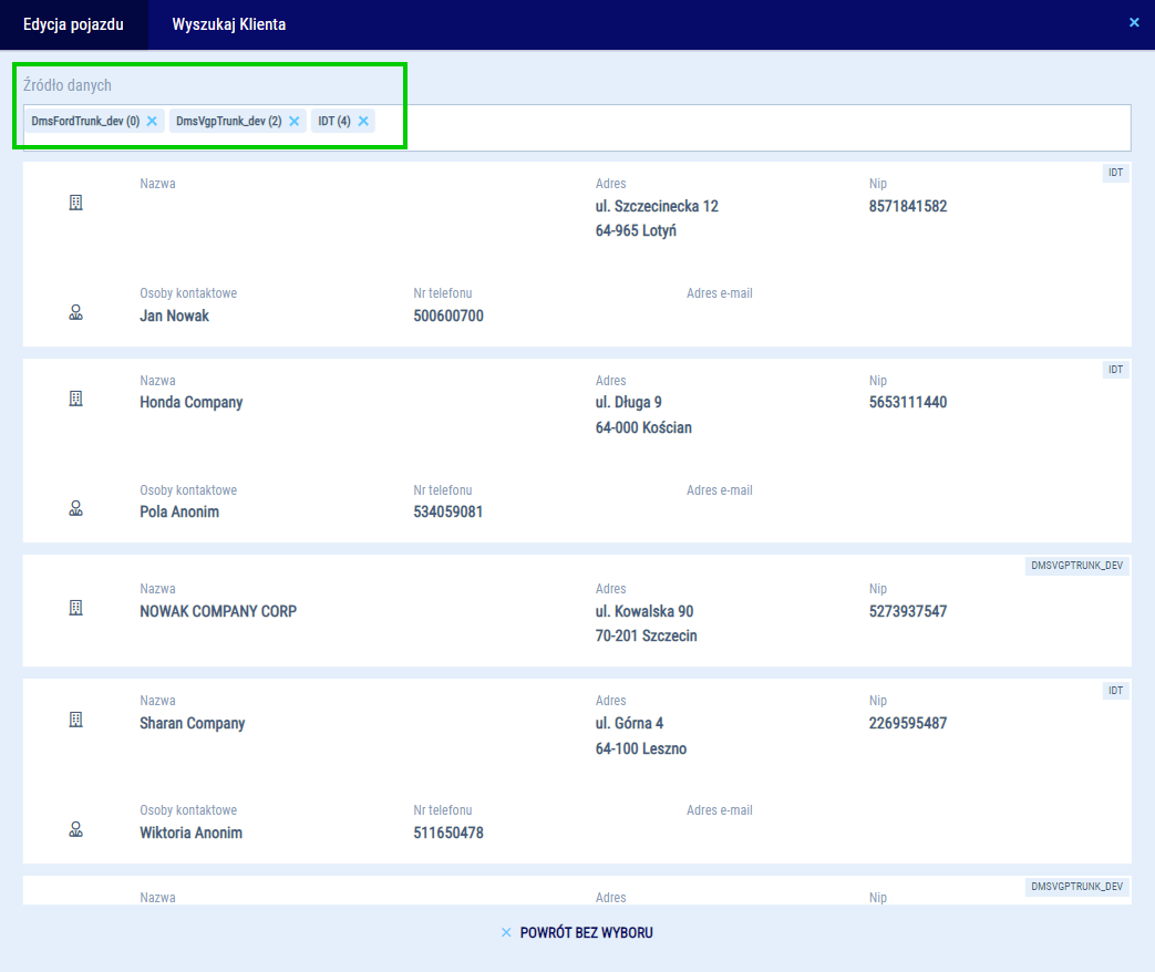 Edycja pojazdu (wyszukiwanie kontaktu)