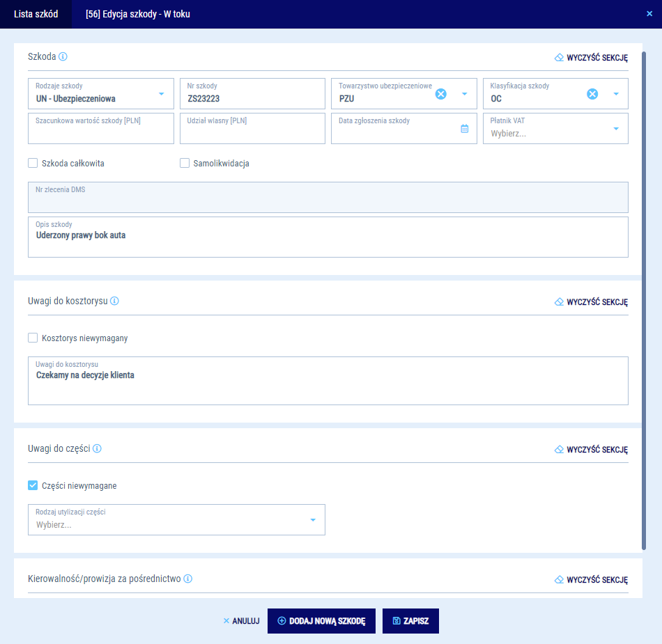 Uwaga :!: Pamiętaj, że edycję szkody możesz również wykonać z poziomu kontekstu naprawy.