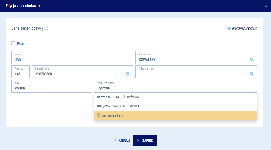 Obszar zleceniodawcy skupia się wyłącznie na kontrahencie, który jest odpowiedzialny za naprawę. Aby edytować dane zleceniodawcy, wybierz operację w sekcji zleceniodawcy. Możesz edytować podstawowe informacje osobowe i adresowe, które uzupełniasz przy okazji tworzenia nowej naprawy.