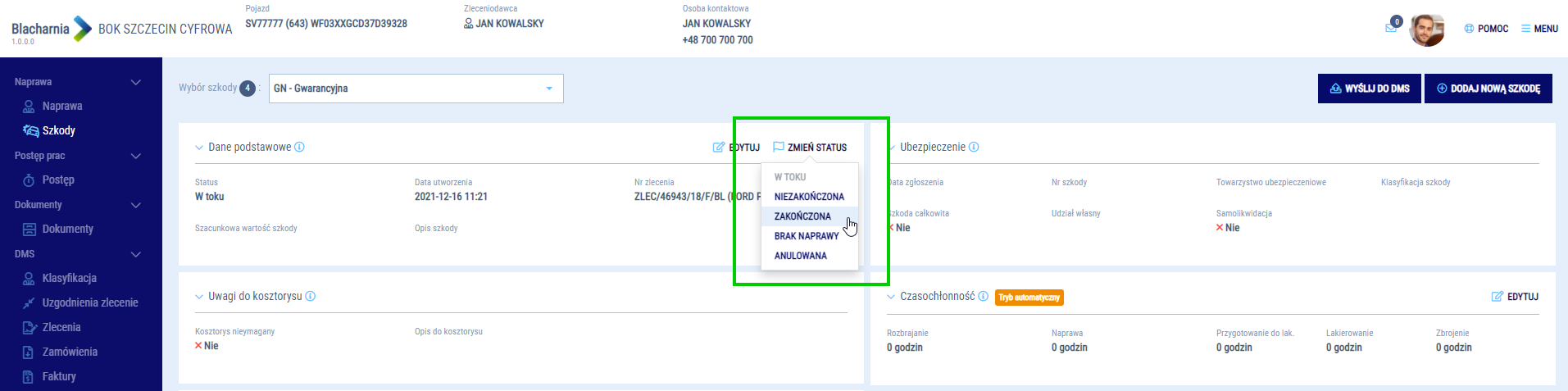 Aby zmienić status szkody wybierz operację . Jeżeli chcesz zmienić status teczki na zakończoną, pamiętaj, aby w systemie oznaczyć pojazd jako wydany klientowi.