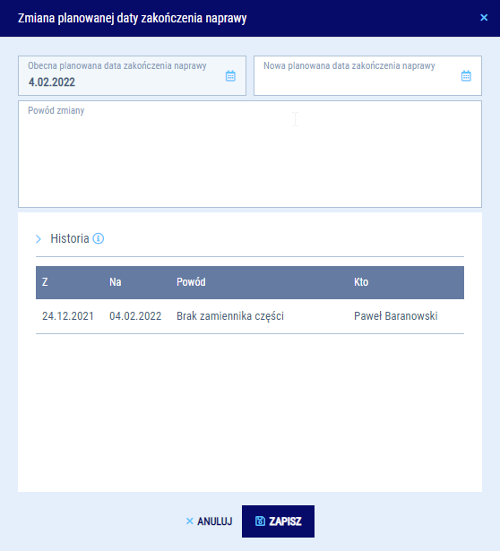 Po wprowadzeniu planowanej daty zakończenia naprawy możesz ją zawsze zmienić. W tym celu wybierz operację . System będzie Cię wspierał i prezentował Twoją historię przeplanowań.