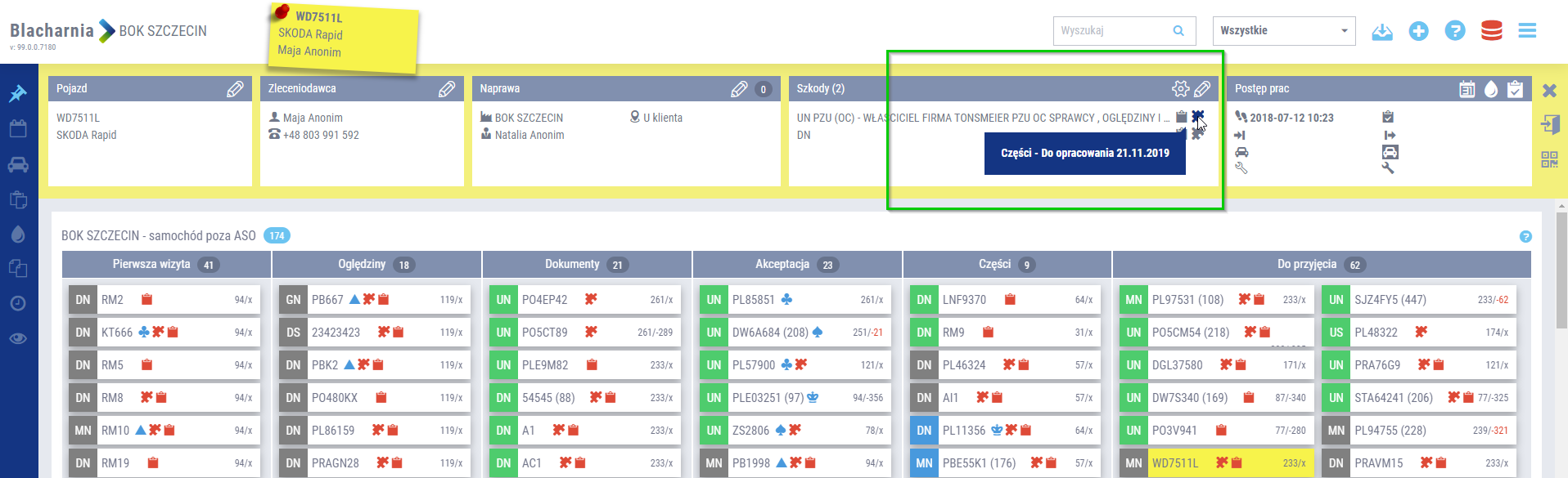 - Kolor granatowy (do opracowania) – szkoda zaplanowana czyli wysłana do działu części ale bez zamówień