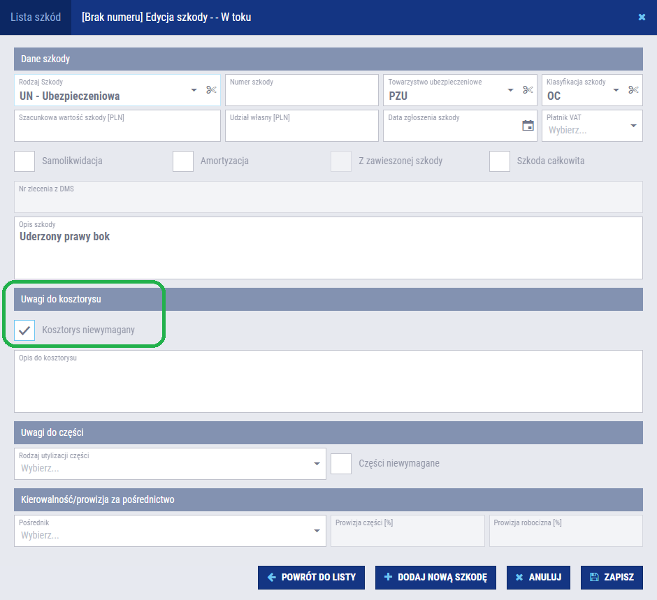 Użytkownik, edytując dane dotyczące każdej szkody, ma możliwość oznaczenia braku wymagalności kosztorysu. Dzięki temu status dotyczący kosztorysu zostaje ustawiony jako zakończony i oznaczony na zielono. Dodatkowo przy próbie pobrania kosztorysu, użytkownik otrzymuje odpowiedni komunikat. W każdym momencie istnieje możliwość powrotu do pierwotnego stanu poprzez ponowne odznaczenie opcji ‘kosztorys niewymagany’.