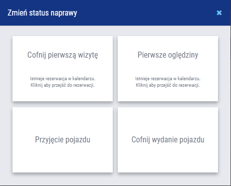 – ikona operacyjna umożliwiająca szybką zmianę statusu naprawy dla wybranych rezerwacji. Pozwala pominąć konieczność zakładania rezerwacji na kalendarzu doradców. W przypadku gdy rezerwacja istnieje w kalendarzu użytkownik zostanie o tym poinformowany komunikatem z możliwością przeniesienia do konkretnej rezerwacji na kalendarzu doradców.