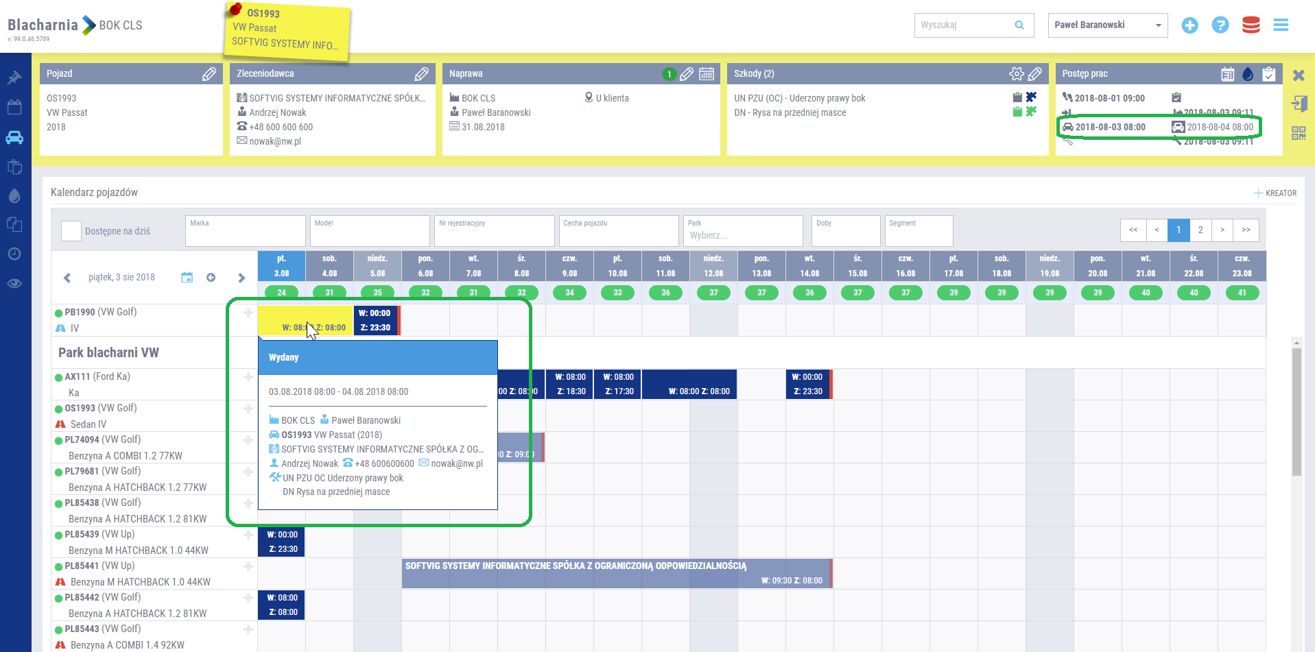 - Pogrubiona data przy ikonie auta – pojazd został wydany do klienta