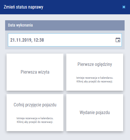 – ikona operacyjna umożliwiająca szybką zmianę statusu naprawy dla wybranych rezerwacji. Pozwala pominąć konieczność zakładania rezerwacji na kalendarzu doradców. W przypadku gdy rezerwacja istnieje w kalendarzu użytkownik zostanie o tym poinformowany komunikatem z możliwością przeniesienia do konkretnej rezerwacji na kalendarzu doradców. Istnieje możliwość wyboru daty wykonania akcji poprzez postęp prac.