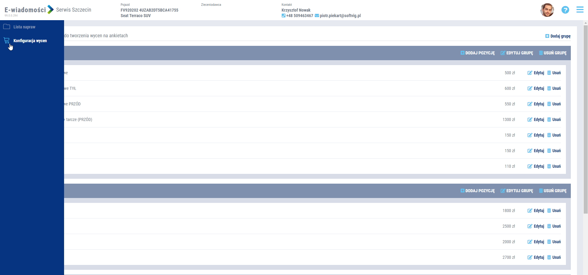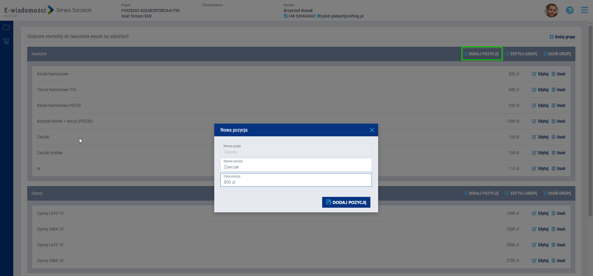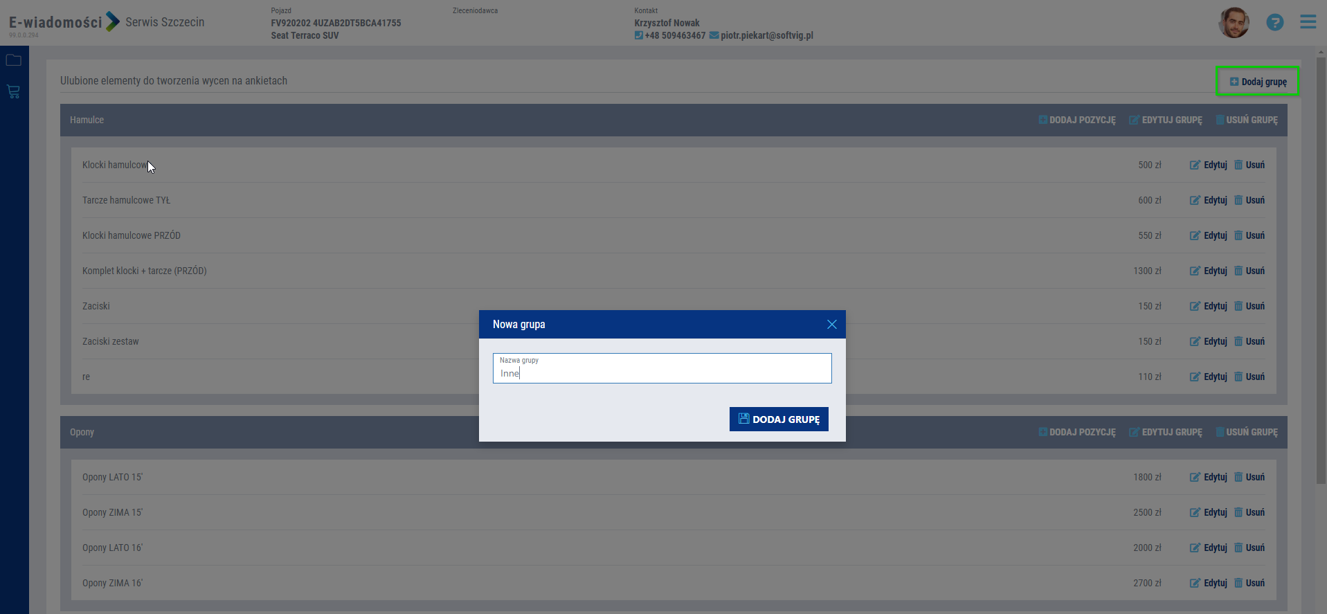 Elementy wycen są pogrupowane tematycznie, zgodnie z klasyfikacją, którą zaproponuje Użytkownik, np. Opony, Akcesoria, Oleje. Aby założyć grupę, należy użyć przycisku „Dodaj grupę”. Następnie utworzyć pozycję grupy za pomocą przycisku „Dodaj pozycję”.