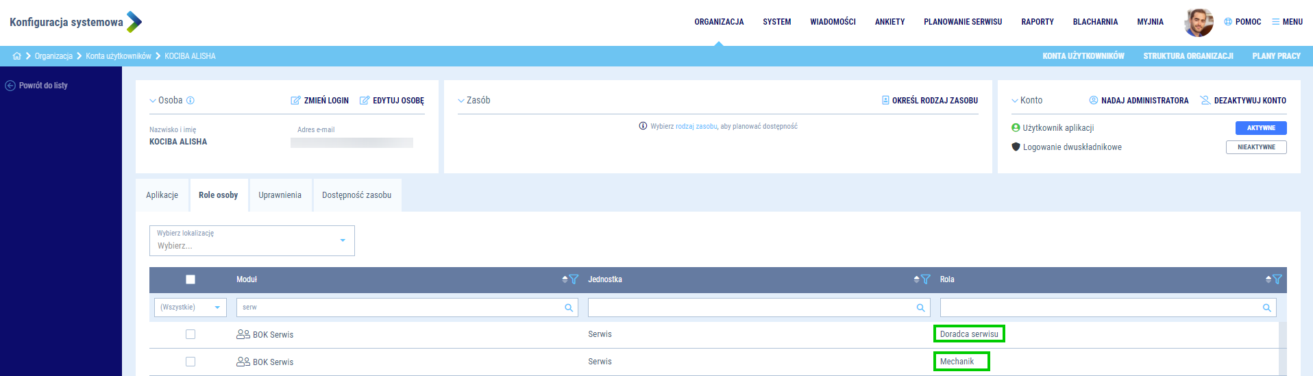 Administrator wybiera role w zakładce . Role definiują dostęp do konkretnych obszarów funkcjonalnych w aplikacjach. W przypadku bardziej skomplikowanych organizacji i większej ilości zakupionych usług platformy warto skorzystać z filtra lokalizacji oraz jednostek.