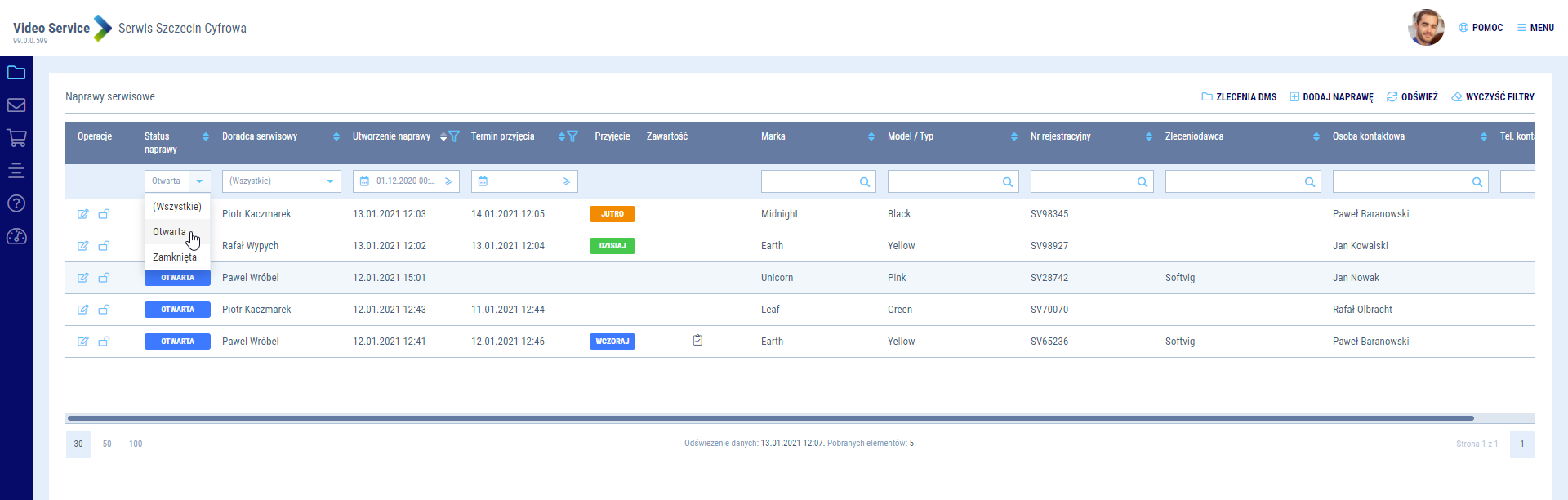 • Otwarta – naprawy w toku (tylko te są domyślnie wyświetlane na liście)