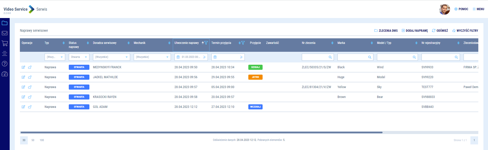 Lista napraw wyświetla się w formie wierszy, które są posortowane według daty utworzenia naprawy w aplikacji Video Service. Każdy wiersz odpowiada pojedynczej naprawie. Tabela wyświetla naprawy tylko z jednej Jednostki. Wszystkie naprawy z danej jednostki są współdzielone i widoczne dla, posiadających dostęp do aplikacji, pracowników z tej Jednostki.