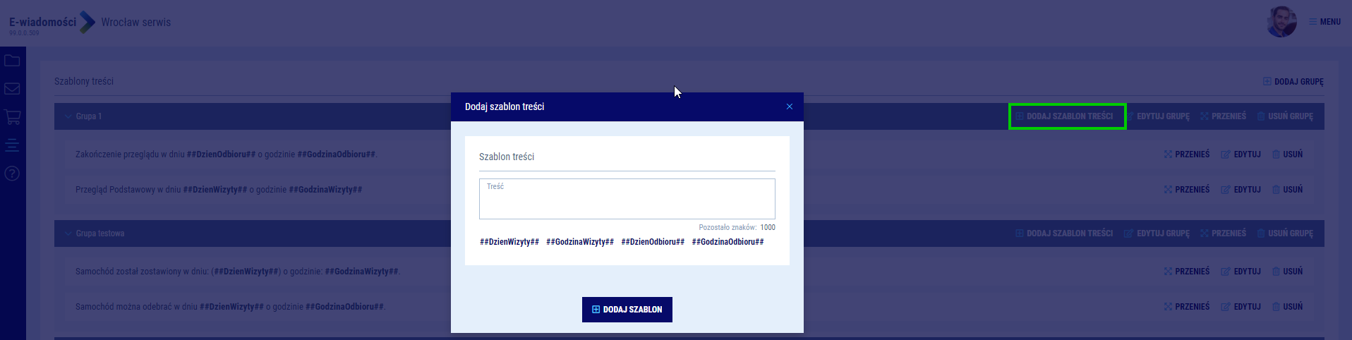 Aby rozpocząć, należy zdefiniować minimum jedną grupę. Następnie zacząć dodawać szablony treści. Dane z naprawy, takie jak data i godzina przyjęcia lub wydania samochodu, zostaną uzupełnione automatycznie, ponieważ szablony treści obsługują tzw. tagi, oznaczone ##.