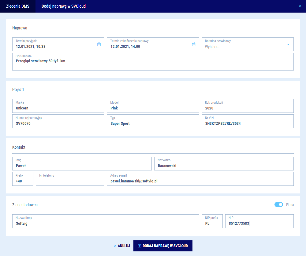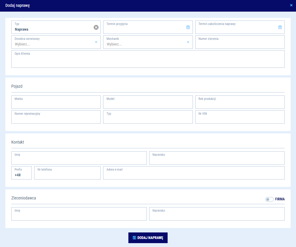 Nowe okno umożliwia wprowadzenie danych dotyczących wizyty, pojazdu, osoby kontaktowej oraz zleceniodawcy. Jedynym wymaganym polem na formularzu jest „Numer rejestracyjny”, ale ważne jest również uzupełnienie numeru telefonu lub adresu email osoby kontaktowej. Te dane są potrzebne do wysłania e-wiadomości do klienta. Po wypełnieniu pól należy nacisnąć przycisk , aby założyć nową naprawę.