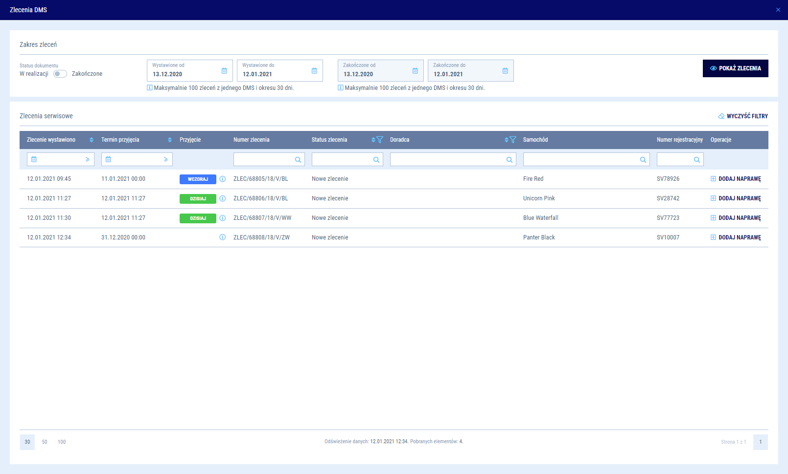 Następny etap, to filtrowanie danych potrzebnych do wyświetlenia konkretnego zlecenia lub zleceń. Domyślnie lista zleceń jest pusta. Użytkownik musi zdecydować jaki zakres danych go interesuje i wybrać operacje . Operacja spowoduje pobranie listy zleceń z systemu zewnętrznego DMS AutoStacja3 wg wybranych filtrów.