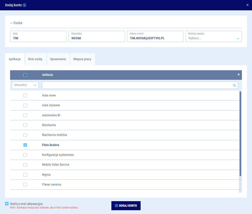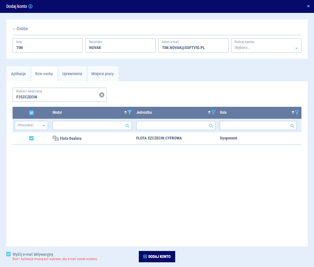 - Dla usługi Flota Dealera masz do wyboru następujące role: