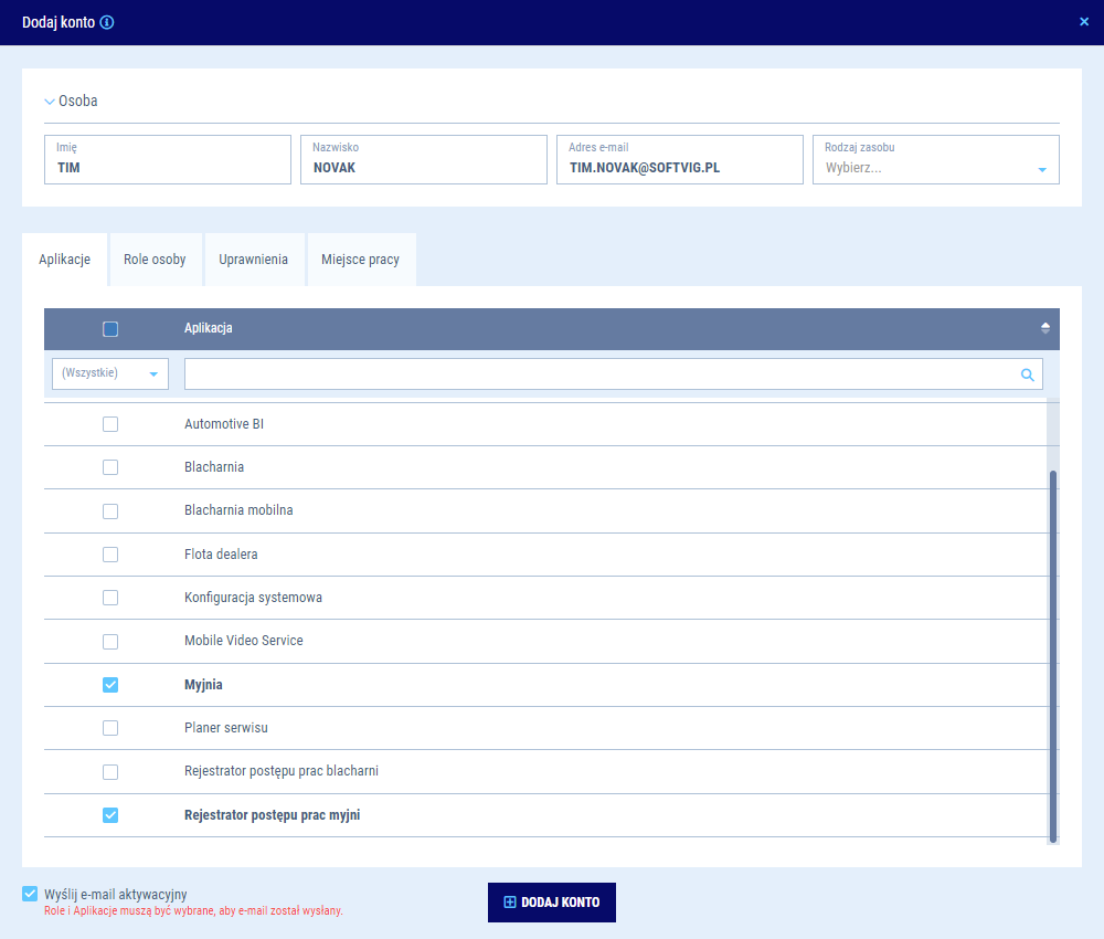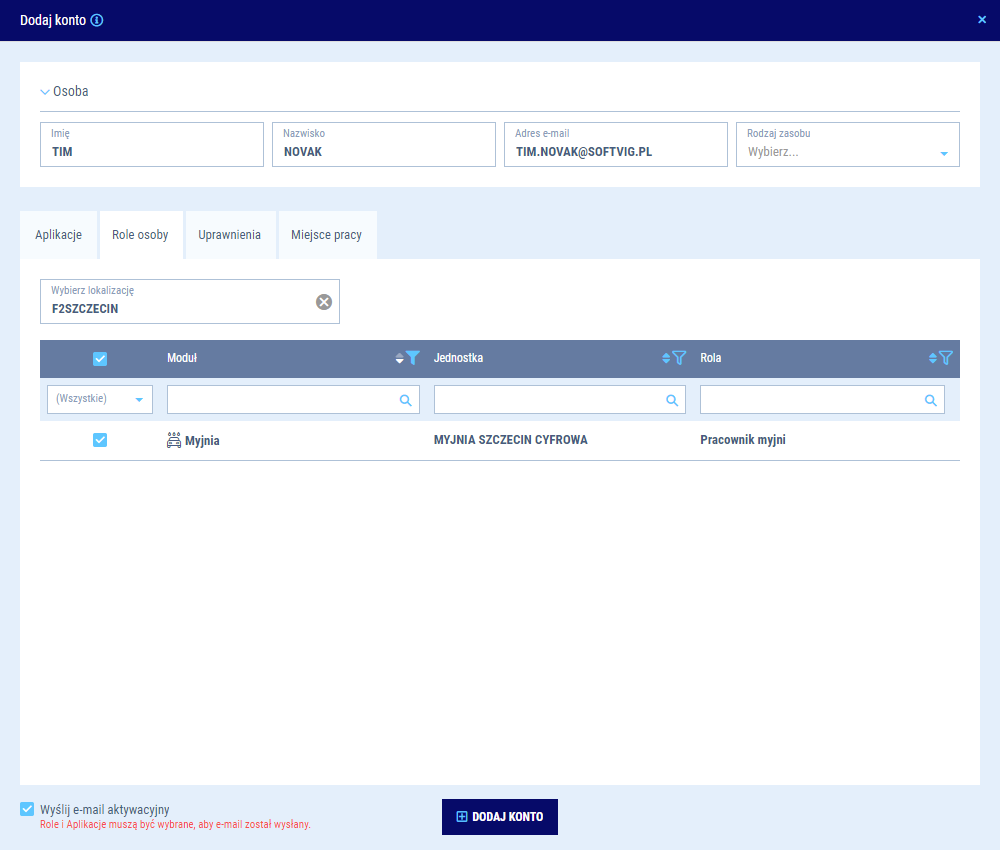 - Pracownik myjni - rola umożliwiająca dostęp do dedykowanego profilu myjni z zestawem poniższych funkcjonalności:
