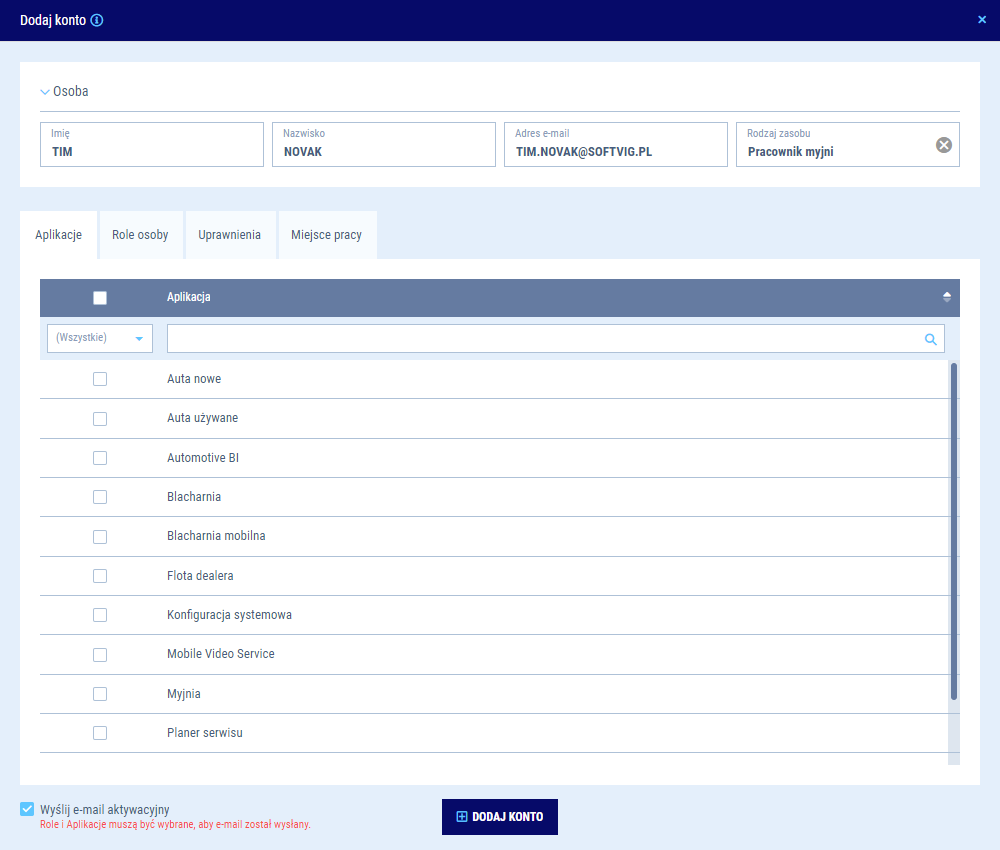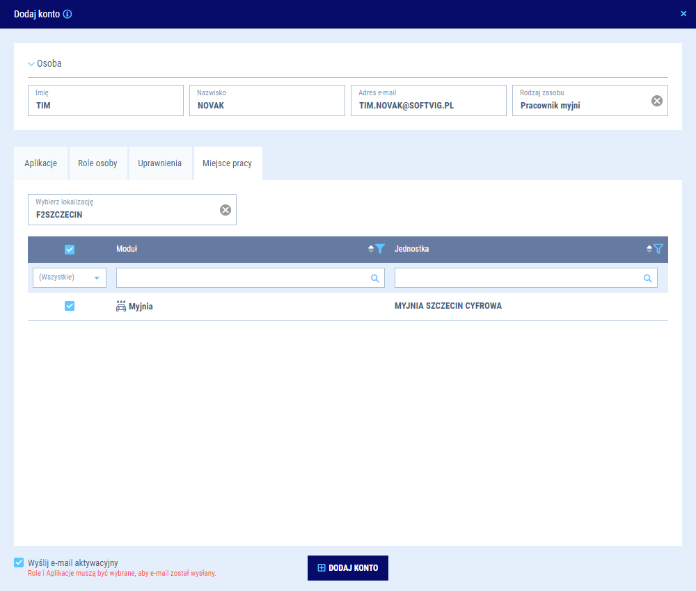 - Pracownik myjni - nadaj rolę umożliwiającą dostęp do dedykowanego działu myjni: